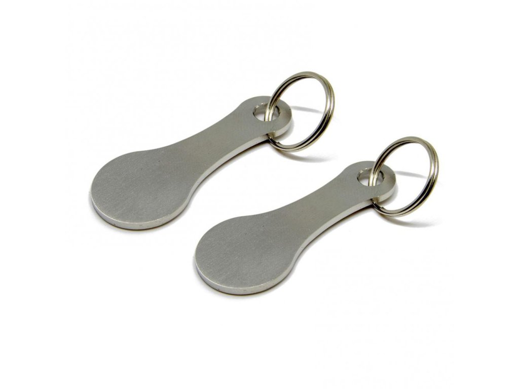 Tento kovový přívěšek v barvě stříbrné slouží jako náhrada mince do nákupního košíku – a na rozdíl od běžných mincí ho nemusíte ve vozíku nechávat.